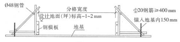 布網(wǎng)鋼筋采用膨脹螈栓焊接法,并按設(shè)計(jì)比例規(guī)格沿棍寧圖澆灌方向排列,實(shí)現(xiàn)基層穩(wěn)固高度固定,減少后期開(kāi)裂,之后采用線(xiàn)繩矯正鋼筋的水平高度和水平直度。在混凝土支模的過(guò)程中,用粘玻璃條替代鋼模板,在地幔厚度較大的情況下,使用通條固定。其只設(shè)方法如圖2。