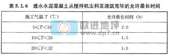 5.2.6透水水泥混凝土拌合物從攪拌機出料后,運至施工地點進(jìn)行攤鋪、壓實直至澆筑完畢的允許最長時間,可由實驗室根據(jù)水泥初凝時間及施工氣溫確定.并應(yīng)符合表5.2.6的規(guī)定。