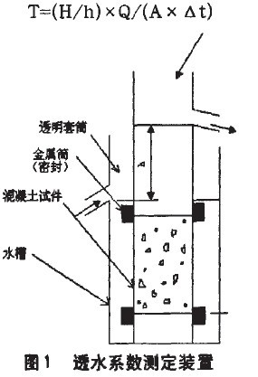本研究的透水性能測試采用日本最近提出的《(固定水位透水測定法》來確定透水系數(shù)。其裝置如圖l所示。該裝置采用高度為H(mm),斷面積為A(mm2)的圓柱形試件,上部密封連接透明的圓柱形套筒,并在套筒的上部設(shè)一流出口。將其放入一個水槽中,水槽的上部設(shè)出水口。水槽出水口至套筒出水口之間的距離為水位差h。試驗前將試件充分飽水,將水槽中充滿水,直至水從出水口流出;從套筒上部不斷給水,使試件上部水位高度保持不變,測定從水槽出水口流出的水量Q(mm3)和出水時間At(s),則透水系數(shù)T按下式計算;
