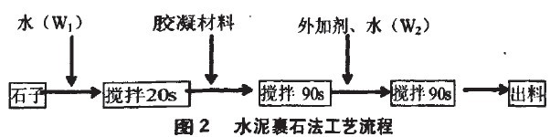 透水性混凝土拌和物中水泥漿稠度較大,且數(shù)量較少,為了保證水泥漿能夠均勻的包裹在集料上,宜采用強制式攪拌機,攪拌時間為2min~4min。其投料次序采用水泥裹石法,其工藝流程如圖2所示。采用這種方法,預(yù)拌水量(w.)為總用水量的8%~10%。這項技術(shù)要注意控制W.,W,太少石子預(yù)濕不完全,下一步加水泥拌和時,形成不了包裹石子表面的水泥漿殼,W.太多則形成的漿殼很稀,易被第二次加水?dāng)嚢钑r沖刷破壞,所以要控制好W,和兩次攪拌時間。