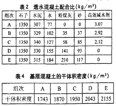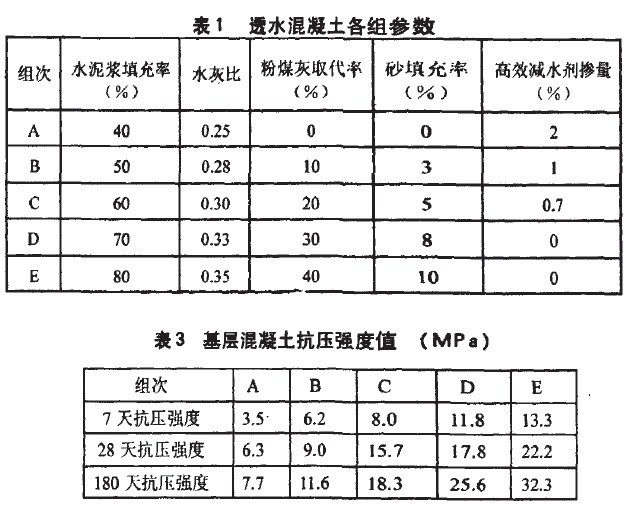 影響透水混凝土的技術(shù)性能的因素有透水方式、材料密度、原材料性能、配合比、成型方法和養(yǎng)護條件等:而對于透水混凝土來說,強度和透水性是對立的,在配合比設(shè)計時必須綜合考慮。表l列出了透水混凝土配合比設(shè)計中的各組參數(shù)。