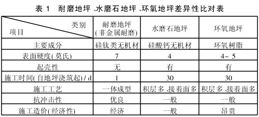 工業(yè)彩色耐磨地坪的施工采用機(jī)械化施工,并且施工時(shí)要和基層混凝土澆筑同步進(jìn)行,與其他地坪相比,可大幅度縮短工期,避免了水磨石地坪施工時(shí)出現(xiàn)的泥漿、污水污染現(xiàn)象,且具有耐磨性好,不起塵;硬度高,可重載;表面致密防滲透;成本低的特點(diǎn)。地坪差異性見表1。
