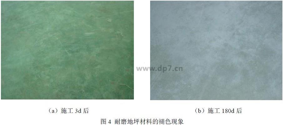 水泥基耐磨地坪的一大優(yōu)勢(shì)是可以根據(jù)客戶需求,通過(guò)改變顏料種類及摻量,得到不同顏色的耐磨地坪。然而,由于很多有機(jī)類顏料耐堿耐候性較差,從而導(dǎo)致地坪在使用過(guò)程中發(fā)生褪色現(xiàn)象,如圖4 所示。