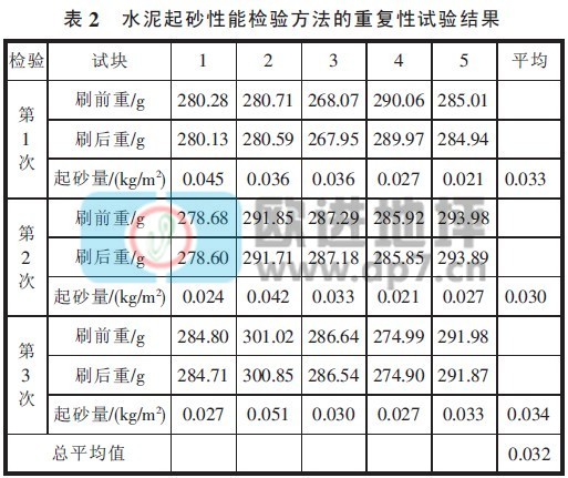 將P·C32.5 水泥, 按上述的起砂性能檢驗(yàn)方法,反復(fù)試驗(yàn)3 次,每次試驗(yàn)5 個(gè)試塊,驗(yàn)證上述檢驗(yàn)方法的可靠性和檢驗(yàn)結(jié)果的重復(fù)性。水泥起砂性能檢驗(yàn)方法的重復(fù)性試驗(yàn)結(jié)果見表2。由表2 可見,3 次檢驗(yàn)結(jié)果的平均值誤差不大,重復(fù)性較好。