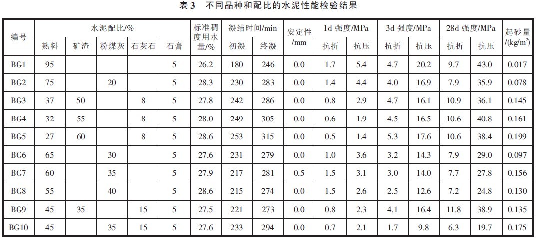 利用1.1 節(jié)的試驗(yàn)材料配制了一系列不同品種和配比的水泥,其物理性能檢驗(yàn)結(jié)果見表3。按1.2 節(jié)試驗(yàn)方法進(jìn)行檢驗(yàn),檢驗(yàn)結(jié)果見表3,可見硅酸鹽水泥(BG1)和普通水泥(BG2)的起砂量較小。