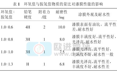 環(huán)氧值與胺氫值物質(zhì)的量比對(duì)漆膜性能的影響在影響水性環(huán)氧地坪涂料的諸多因素中,環(huán)氧脂與固化劑的配比最為重要,主要是指環(huán)氧值與胺氫值物質(zhì)的量比[5]??疾飙h(huán)氧值與胺氫值物質(zhì)的量比對(duì)漆膜性能的影響,試驗(yàn)結(jié)果見(jiàn)表
