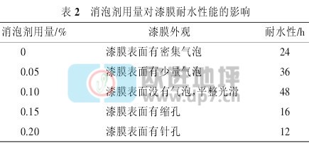 可知,隨著消泡劑用量的增加,漆膜表面出現(xiàn)有泡、無(wú)泡、縮孔等情況,而且其耐水性隨著消泡劑用量的增加出現(xiàn)先增后減的情況。當(dāng)消泡劑用量為 0.1%時(shí),漆膜外觀最好,而且耐水性也好,所以選擇的消泡劑最佳加入量為0.1%。
