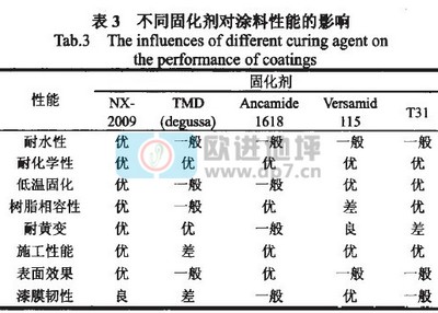 由表3可知,NX.2009的綜合性能明顯優(yōu)于常規(guī)的環(huán)氧樹脂固化劑,適用于無溶劑環(huán)氧自流平地坪固化系統(tǒng)。本研究選定NX.2009為配方固化劑。