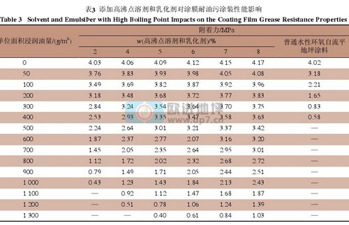 從上述試驗結(jié)果可以看出,高沸點(diǎn)溶劑和乳化劑的加入對提高耐油污涂裝性能有非常明顯的效果,它能夠使涂料在含油污較多的底材上涂裝并且仍具有優(yōu)良的附著力。對施工固化后的涂膜切面進(jìn)行對比,發(fā)現(xiàn)添加了高沸點(diǎn)溶劑和乳化劑的多功能水性環(huán)氧自流平地坪涂料的涂膜內(nèi)部有油污遷移進(jìn)去,顏色受油污顏色影響變得褐黃,而普通水性環(huán)氧地坪涂料油污則全部聚集在涂膜與底材的接觸面上,涂膜內(nèi)部沒有油污出現(xiàn)。
