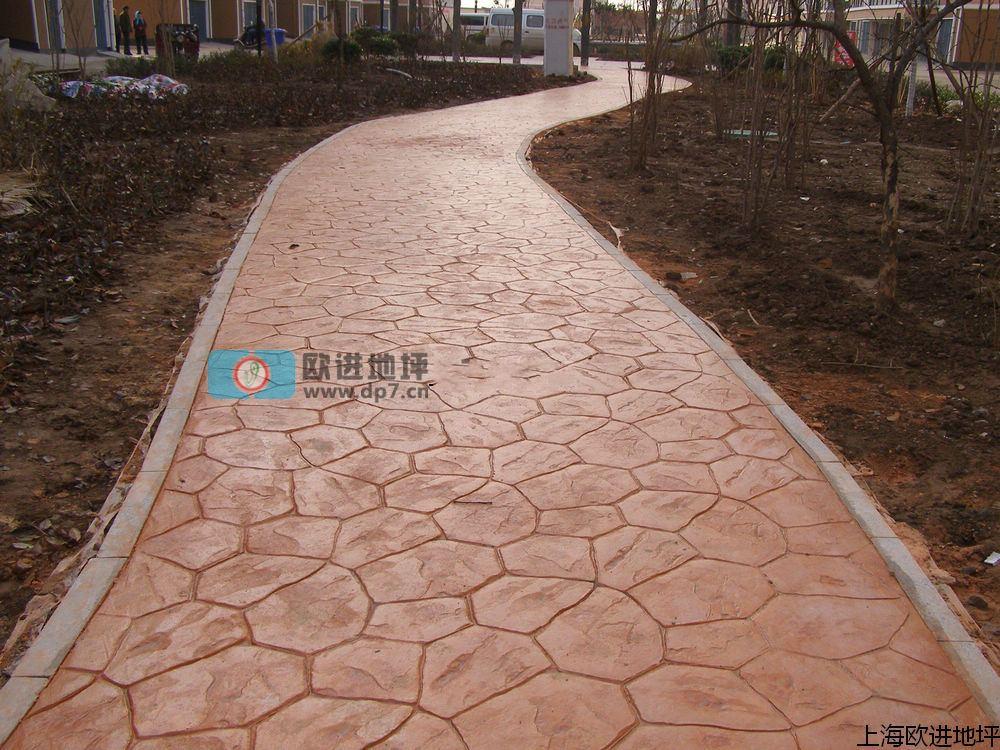 11. 待壓膜粉和脫模粉結(jié)合在一起但又未完全凝固前,即可以使用成型模進(jìn)行壓印成型。要事先研究并制訂成型模排列及提放的位置及方向,確保圖案的整體性。將第一塊成型模沿著放樣圖案參照線鋪設(shè),并將其垂直壓進(jìn)混凝土內(nèi)。掌握壓模的時(shí)間非常重要,太濕或太干的混凝土表面都會(huì)影響最后的圖案及效果。