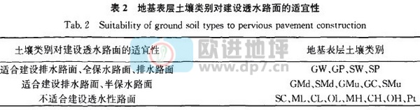 透水地坪路面的工程選址與類型選擇之地質(zhì)條件,地質(zhì)條件主要指原地基土的性質(zhì),調(diào)查地質(zhì)條件可確定2大問(wèn)題:其一,原地基是否適合建設(shè)透水路面;其二,若可建設(shè),宜建何種類型的透水路面.目前,美國(guó)、臺(tái)灣等地均按照《Standard Practice for Description and Identification of Soils(Visual——Manual Procedure)》(ASTM 1")2488—2006)進(jìn)行透水路面地層土壤的描述與鑒別,該法先進(jìn)行地表土層取樣,制成非原狀土樣后進(jìn)行目視一手工操作鑒別,最后按統(tǒng)一土壤分類法分類.據(jù)國(guó)外經(jīng)驗(yàn),可將地基土按適宜建設(shè)透水路面程度的不同分為表2所示的3類.由其可見(jiàn),適宜建設(shè)透水路面的多為砂性土地基,粉土、飽和度較高的粘性土則不宜建設(shè),這一結(jié)論值得我國(guó)參考.當(dāng)土基不符合要求,但又必須建設(shè)時(shí),應(yīng)先對(duì)地基進(jìn)行加固處理、甚至是換土。