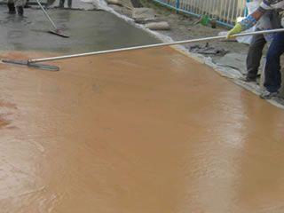 | 藝術(shù)地坪施工5. 將標(biāo)準(zhǔn)用量(4.5kg/㎡)的1/2歐進(jìn)彩色硬化劑均勻播撒在初凝階段的混凝土表面; |