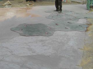 | | 藝術(shù)地坪施工6. 待歐進(jìn)硬化劑蔭濕后用手工鐵板或大抹刀進(jìn)行第一次找平收光,不要過分鏟抹混凝土表層,這樣會(huì)導(dǎo)致表面出水并減弱色彩; |