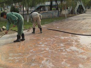 | 藝術(shù)地坪施工11. 沖洗的地坪表面干燥后,涂刷歐進(jìn)亮光養(yǎng)護(hù)劑. 使壓模地坪表面防污染防滑性能再次加強(qiáng). 完成后的硬化壓模地坪除了很好的裝飾性以外,其物理性能也非常穩(wěn)定; |