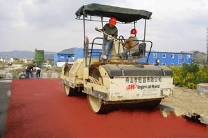 1 彩色瀝青與普通瀝青混合料的拌和基本相似,但應(yīng)著重注意拌和前,應(yīng)將攪拌站的拌和缸和瀝青輸送管道、運輸車、施工機械設(shè)備等清洗干凈,防止色彩干擾。拌缸可用加熱后的粗集料清洗3~4 次,基本就能清干凈了。2 拌和溫度最好控制在160℃~180℃,拌和時間比普通瀝青混合料多10s 左右,在出料口及時檢查粒料顏色是否均勻。嚴格控制各材料的加熱溫度和出料溫度。過高的溫度會影響混合料色澤,超過190℃的混合料應(yīng)予以廢棄。