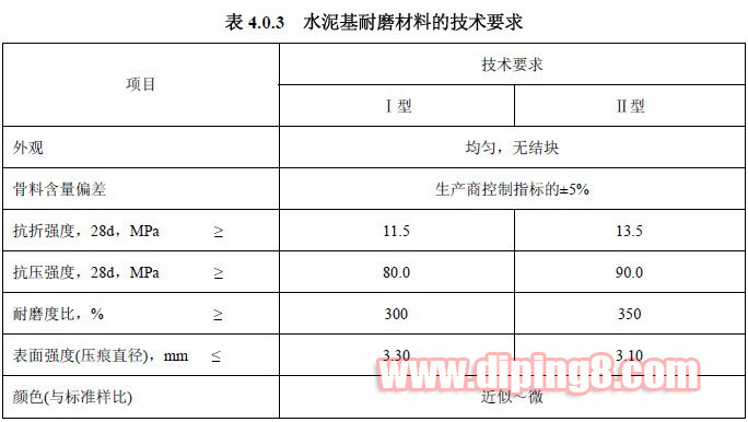 水泥基耐磨材料的骨料含量應(yīng)在質(zhì)保書中明示,其性能指標(biāo)應(yīng)符合表 4.0.3 的規(guī)定。