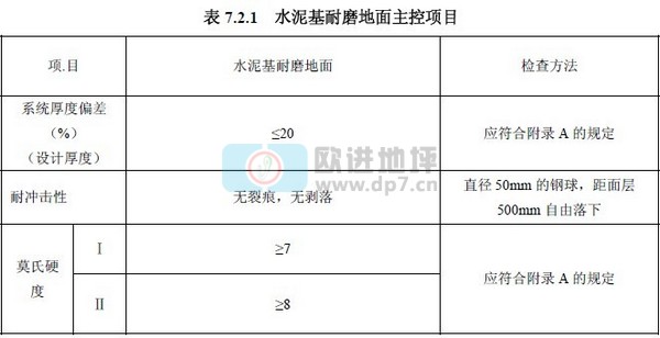 水泥基耐磨地面主控項目的驗收應符合表 7.2.1 的規(guī)定。
