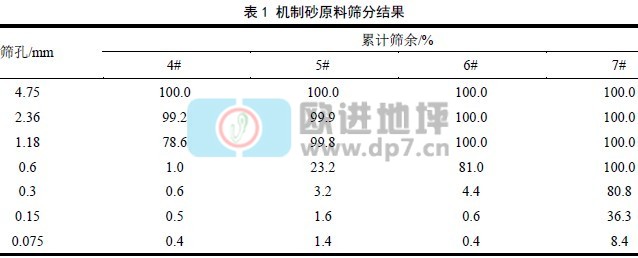 耐磨地坪砂漿中骨料使用的是不同型號(hào)的機(jī)制砂,其篩分級(jí)配表1 所示。