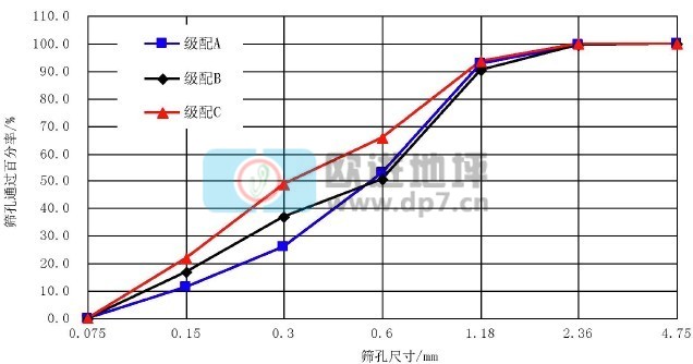為研究砂的顆粒級(jí)配對(duì)材料性能的影響,我們?cè)O(shè)計(jì)了三組級(jí)配,如表 2 所示。