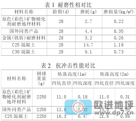 表1、表2列出了彩色耐磨地坪材料與金屬(鐵屑)耐磨材料、國外同類產(chǎn)品以及C25、C30混凝土的耐磨性能和抗沖擊性能對比結(jié)果。