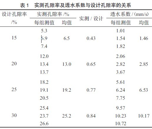 試驗(yàn)采用粒徑為10~20 mm 的碎石,設(shè)計(jì)透水混凝土的孔隙率為15%、20%、25%和30%時(shí),研究設(shè)計(jì)孔隙率、實(shí)測孔隙率與透水系數(shù)的關(guān)系,試驗(yàn)結(jié)果見表1 及圖1。