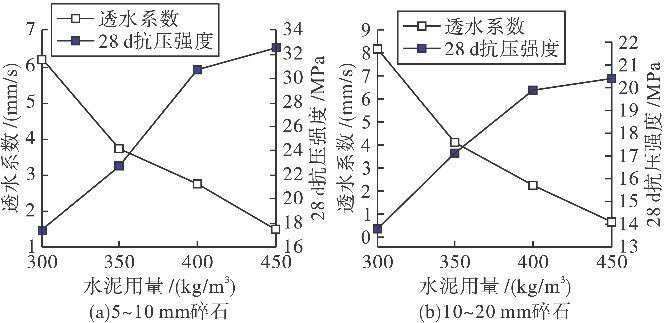 從圖3 中可以看出,不論使用哪種石子,透水混凝土的抗壓強(qiáng)度皆隨水泥用量的增加而增加,而透水系數(shù)則隨著水泥用量的增加而減小。在相同水泥用量的情況下,對(duì)比兩種不同粒徑的碎石可發(fā)現(xiàn),使用5~10 mm 的碎石配制的透水混凝土抗壓強(qiáng)度值較高,但透水系數(shù)較低,而10~20 mm 的碎石得到的相反結(jié)果。使用大粒徑骨料配制的透水混凝土抗壓強(qiáng)度較低,主要是因?yàn)楣橇狭皆酱螅橇祥g的咬合點(diǎn)越少,由此產(chǎn)生的咬合摩擦力及其與水泥漿體的黏接力減少所致。因此,進(jìn)行透水混凝土的配合比設(shè)計(jì)時(shí),有必要把“骨料級(jí)配與粒徑”作為一個(gè)設(shè)計(jì)參數(shù),根據(jù)設(shè)計(jì)要求選擇合適的骨料級(jí)配與粒徑,才可得到透水系數(shù)和抗壓強(qiáng)度相匹配的透水混凝土。