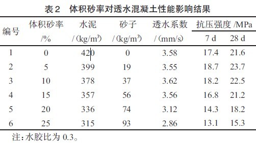由表2 中可知,體積砂率在0~15%范圍內(nèi)透水系數(shù)變化較小,當(dāng)體積砂率超過15%時(shí),透水系數(shù)明顯下降。這主要是因?yàn)椋谂浜媳仍O(shè)計(jì)中,砂子等體積取代水泥,透水混凝土的孔隙率保持不變,因此其透水系數(shù)隨著體積砂率的變化較小;但體積砂率超過一定值后,由于骨料的級(jí)配得到改善且砂子堵塞透水混凝土孔隙的幾率增大,從而導(dǎo)致透水系數(shù)下降。