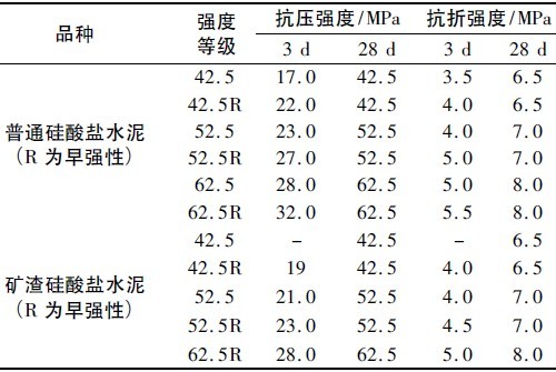 表1 普通硅酸鹽水泥和礦渣硅酸鹽水泥的強度要求( GB175 - 99,GB1344 - 92)Table 1 The strength requirement of ordinary portlandcement and slag silicate cement ( GB175 - 99,GB1344 - 92)