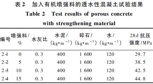 試驗表明,隨著增強(qiáng)料摻量的增加,透水性混凝土強(qiáng)度也增加。但考慮增強(qiáng)料的成本影響,應(yīng)根據(jù)設(shè)計強(qiáng)度要求確定摻量。