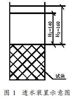 透水系數(shù)的測定: 本試驗采用自制的透水裝置(圖1), 為了測定試塊成型方向的透水性能, 將試件的四周側(cè)面用蠟進(jìn)行密封處理, 再與透水裝置連接并用蠟密封連接處, 確保裝置中的水沿混凝土內(nèi)部連通孔通過, 在透水裝置中加入大于200mm高的水, 測定水位從160mm 降至140 mm時的時間v t1 和水位從160mm 降至0時的時間v t2, 計算定水位透水系數(shù)v1 和變水位透水系數(shù)v2。透水系數(shù)的計算公式為: v =H /v t; v) ) ) 透水系數(shù), mm / s, H ) ) ) 水位下降高度, 定水位為20 mm、變水位為160 mm; v t) ) )水位下降時經(jīng)歷的時間s。