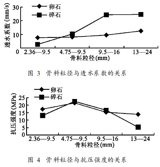 透水系數(shù)反映透水混凝土的透水性能, 強(qiáng)度的大小反映混凝土的力學(xué)指標(biāo), 透水系數(shù)和抗壓強(qiáng)度作為透水混凝土的兩個重要性能指標(biāo), 其數(shù)值大小關(guān)系到透水混凝土的使用效果及應(yīng)用程度, 對透水混凝土透水系數(shù)和抗壓強(qiáng)度的研究已成為一項重要的研究內(nèi)容。本文主要研究了骨料品種、骨料粒徑對透水混凝土主要性能的影響, 為配置高性能透水混凝土提供依據(jù)。